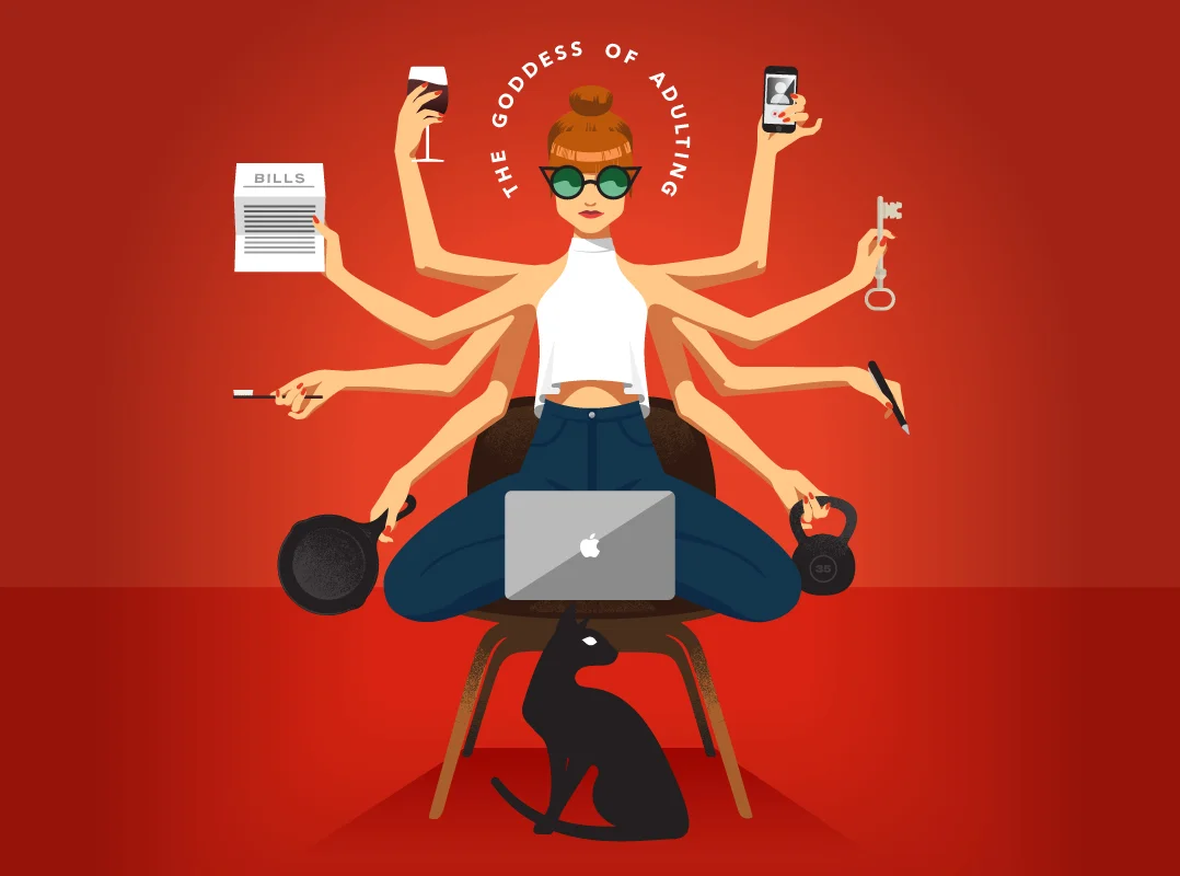 We chose to represent the complexity of "Adulting" by referencing the many armed Hindu deities. Her many arms represent agility and balance, qualities needed to successfully adult.
