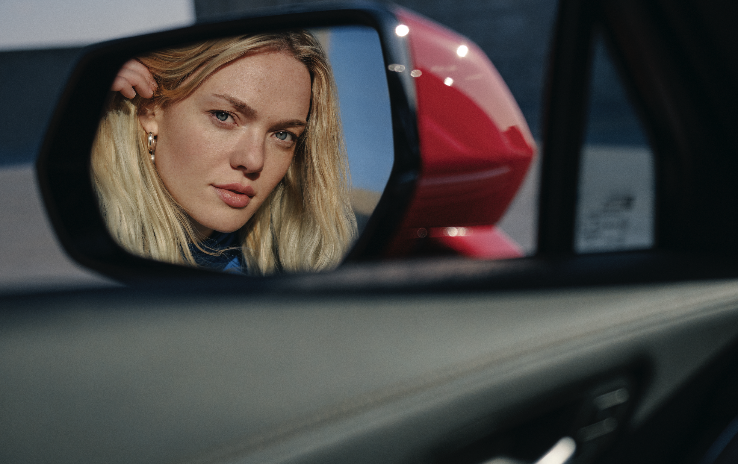 blonde model in blue dress with wind swept hair looks over shoulder while walking past red Cadillac suv